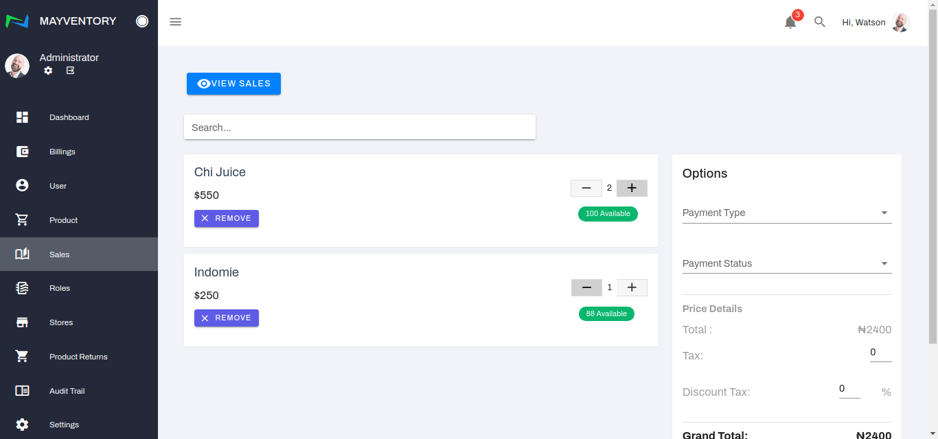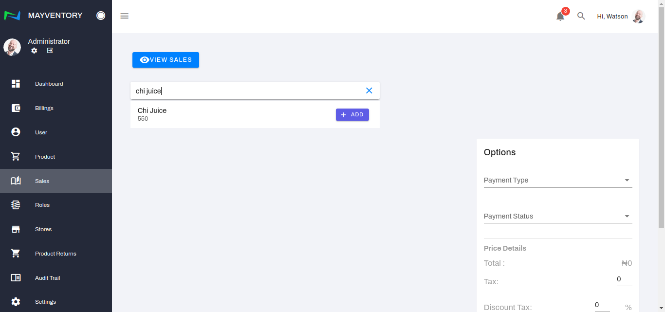 Click on the search box and type in the product that has just been sold or is about to be sold. In our example(image below), it is Chi Juice.