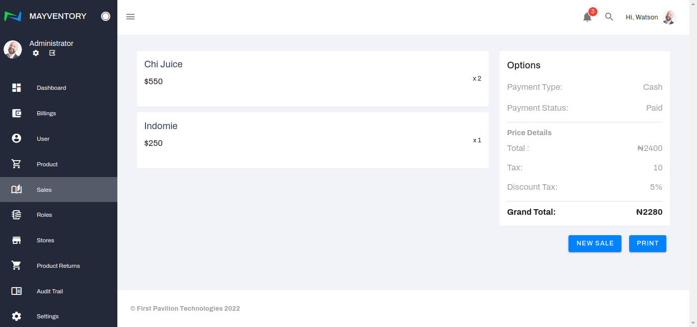 Finally, you would get taken to a page where you can either print the invoice or record a new sale. The option is yours!