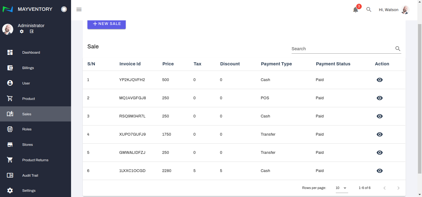Action: This contains a button used to perform advanced action on a recorded sale. When you click on the eye-like icon, you will get directed to a page where you can perform advanced activities like sending an invoice via email or printing an invoice out.